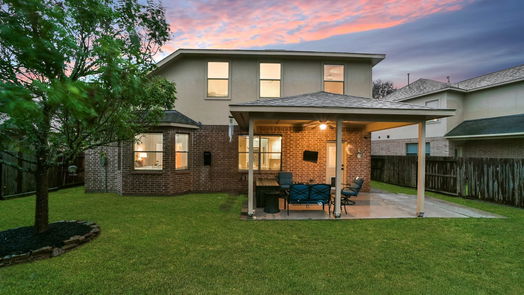 Welcome to this delightful home in the highly desired neighborhood Lakes of Bella Terra! Traditional two-story home w/front porch, features wood-look tile throughout & fresh neutral paint. NO CARPET! Two-story entry, showcases a gorgeous curved wrought iron staircase. Crown molding throughout! Inviting living room features gas fireplace & flows seamlessly into the open concept kitchen & breakfast room. Remodeled kitchen features white cabinets, hardware, granite countertops, tiled backsplash, & breakfast bar. First floor owners suite features continued crown molding & bay windows. Ensuite primary bath w/custom updated mirrors, and spacious walk in closet! Upstairs find your oversized game room, 3 additional generously sized bedrooms & full bath. Backyard boasts covered patio, extended concrete slab AND plenty of green space! LOBT features a fitness center, 2 neighborhood pools, dog park, soccer field, playgrounds, stocked fishing ponds, miles of paths around the many lakes AND MORE.