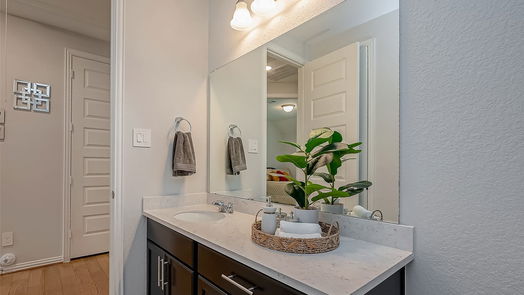 Welcome to a contemporary haven where modern elegance meets thoughtful design. This meticulously maintained, gently used home is still under builder warranty and offers an exceptional living experience with its open floor plan and high-quality finishes. The open-plan living area boasts expansive light-colored walls and medium-toned wooden flooring, creating a seamless and airy environment. High ceilings with recessed lighting add to the room's spacious feel, while large windows flood the space with natural light, offering a perfect backdrop for relaxation or entertaining. The kitchen stands out with its sleek design, featuring a large island topped with speckled gray stone, providing ample space for meal prep and casual dining. Primary bedroom offers a serene retreat with soft, light-colored walls and high-positioned windows allowing sunlight to grace the room. Indulge in a sleek bathroom designed for relaxation.