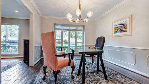 This welcoming home offers 3 bedrooms and 2.5 bathrooms. A spacious dining area and open floor plan allow natural light to flow throughout. The living areas feature wood-look tile flooring, crown molding, and refined architectural details, while the den/family room includes parquet wood flooring for added warmth. The kitchen boasts ample countertop space, an expansive island, and abundant storage, creating a functional & elegant space. The backyard is a private oasis with a sparkling pool, covered patio, backing up to Rivercrest. The primary suite serves as a tranquil retreat. En-suite with soaking tub, walk-in shower, & double sink vanity. Traditional exterior design, spacious lot, & two-car garage w/ a finished interior. Recent upgrades: water heater (2022), pool resurfacing (2021), pool motor & gasket seals (2023), freshened interior paint (2024), and refaced secondary bath cabinet doors. Additional features include a sprinkler system, double-pane windows, & gutters w/ leaf guards.