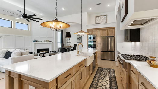 Welcome home! Indulge in luxury with this stunning one story home located in Noble Greens in the Woodforest Community. This elegant home boasts an open floor plan with a host of beautiful finishes. As you step through the expansive double doors, you will be greeted by a thoughtfully designed layout. Soaring ceilings, wood floors, ensuite guest room for privacy, media room, and formal dining. The amazing kitchen is open to the living room with large glass doors out to the gorgeous backyard paradise. Escape to the primary suite including a beautifully done bathroom with soaking tub, spacious separate shower, dual vanities, and a large walk-in closet that connects to the laundry room. The tandem garage hosts an air conditioned flex room which could be used as a workout room or converted to a 4th bedroom...