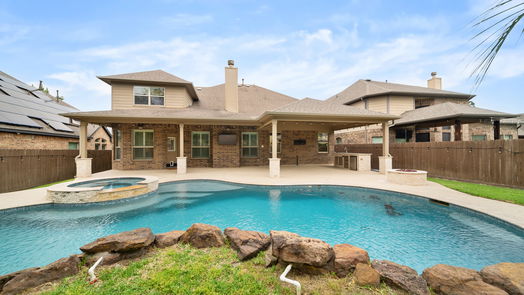 This stunning home is ideally located on a cul de sac street in the amenity-rich master planned community of Eagle Springs, and is zoned to fantastic schools! Home features brick and stone facade, upgraded interior lighting, study, formal dining, remodeled kitchen with quartz counters and stainless steel appliances, living room with soaring ceilings and gas fireplace, primary retreat with wood floors, remodeled en suite bath, and a walk in closet with built in storage system! Upstairs there are three secondary bedrooms, one full bathroom, an expansive game room, and a media room! Enjoy the view of the immaculate back yard and sparkling pool with spa from the covered patio, complete with an outdoor kitchen and gas fire pit! Carpet replaced 4/24! Zoned to Atascocita Springs Elementary and West Lake Middle! Neighborhood amenities include tennis and pickleball courts, baseball and soccer fields, resort and competition style pools, splash pad, parks, fitness center, and a ton of events!