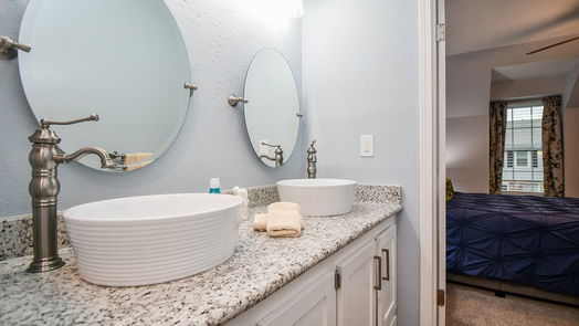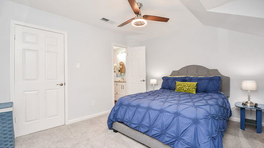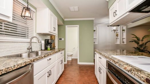 Beautiful 2-story brick townhouse with two assigned covered parking spaces! Two bedrooms and one and half baths; Light, neutral tones throughout - the kitchen is bright, with white cabinetry, slab granite countertops and a garden sink looking out to the patio. Beautiful wood-look tile flooring in all living areas; open concept floorplan. The main bathroom upstairs has been renovated, including a granite countertop, new sinks and faucets, new light fixture and new commode. New carpet in the bedrooms and bedroom closets. Both bedrooms have a walk-in closet. Private covered patio, community pool. Monthly HOA fees cover all utilities. Near the Energy Corridor, with easy access to I-10 and BeltWay 8. Just minutes to Bear Creek Pioneers Park, which boasts hiking trails, tennis and pickleball courts, baseball and soccer fields.