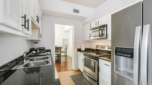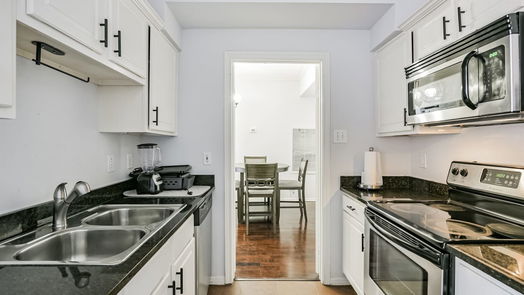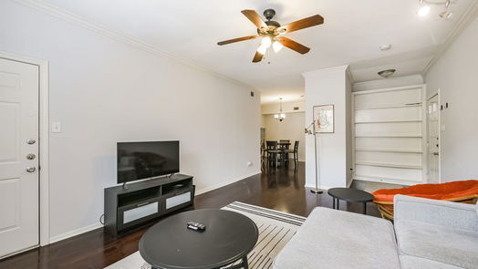 Well maintained upstairs 2 Bedrooms 2 Full Baths condo. Laminated wood floor in living/dining areas; fresh warm custom paint on walls, blinds, granite tops, stainless steel appliances in Kitchen, comes with fridge, washer/dryer; ceiling fans in living, dining, and 2 bedrooms; built-in shelves + pantry in kitchen! Both bedrooms are very spacious with walking closets. Abundance of natural light. Gorgeous hardwood floors throughout. No carpet! Tile in kitchen and bathrooms. Well maintained community with area pool, clubhouse and fitness center. Water and trash pick-up included in rent! Great location walking distance to grocery stores, restaurants, shopping, metro rail and hike & bike trails. Only a few minutes to the Medical Center, NRG Stadium, Museum District, Rice Village and Downtown. Easy access to Loop 610. Never flooded! City lifestyle at its best.