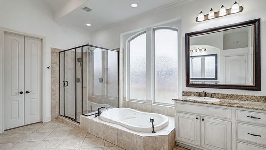 This exquisite Trendmaker home in Cross Creek Ranch is set on a spacious 80-foot corner lot within a peaceful cul-de-sac. It offers 5 bedrooms (2 conveniently located downstairs), 4 full baths, 1 half bath, a 3-car garage. Enter through double front doors into a grand foyer with tile flooring and an incredible kitchen featuring a large island and stainless steel appliances. The expansive family room, complete with a beautiful fireplace, provides a perfect spot for relaxation. The primary suite and a second bedroom with a private bath are on the main floor, while upstairs, there are three additional bedrooms, two full bathrooms, a game room, and a media room. The impressive outdoor living space includes a sparkling pool, a covered patio, a remote-controlled pergola, an outdoor kitchen and stately palm trees. Additional highlights include a full sprinkler system, water softener, plantation shutters, and access to Katy ISD. Just a short walk to Flewellen Creek Pool and a dog park.