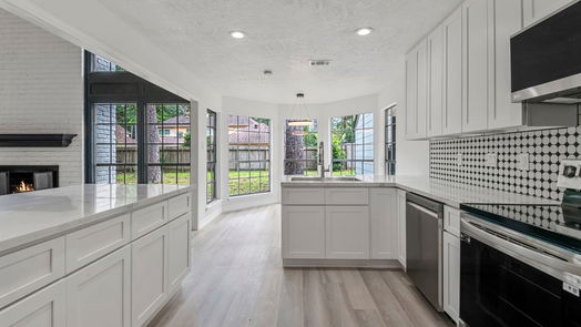 Completely remodeled 4 bedroom home in Kingwood! Charming Tudor exterior with gabled roof lines, leaded glass windows & fresh paint. Upon entering, the formal living and dining room greet you to the left and right. The formal living can be used as a home office. Beautiful living room with a dramatic ceiling, painted wood beams, a wood-burning fireplace surrounded by a wall of windows & a charming wet bar. Updated kitchen with quartz countertops, new cabinets, stainless steel appliances, single basin sink & a new refrigerator! New laminate flooring throughout the first floor! Master bedroom on the first level with an updated bathroom featuring dual sinks, ample closet space & a rainfall showerhead! Four additional bedrooms upstairs with an updated hall bathroom. Generously sized backyard with shade trees and large patio. 2 car garage with a new garage door, 2 new AC systems, new roof, new water heater and so much more!