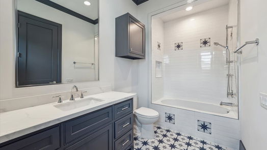 Remarkable River Oaks recent construction 5-Bedroom residence offering a distinguished modern design combined with exceptional amenities and a fabulous floor plan enhanced by spectacular scale and abundant natural light. Dramatic 2-story Entrance Hall opens to fabulous formals and a private Study. Butler's Bar. Climatized Wine Vault. Gourmet Island Kitchen with adjacent informal dining room. Family Room with full bath, summer kitchen, and a retractable wall of windows and doors opening to a central pool terrace for indoor/outdoor enjoyment. Primary Suite up with fireplace and luxurious bath with designated dressing rooms. 4 Guest Suites + Game Room up. 2 Staircases. Elevator-installed. Home Generator. Saltwater Swimming Pool/Spa with water features and glass safety enclosure. Artificial Lawn. Gated Motor Court leads to a 2-car attached Garage which has been repurposed as a Fitness Center and may be reconfigured back to its original function.