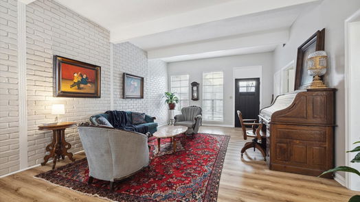 Rare single-story townhouse updated and in pristine condition. Home features new wood floors throughout, exposed brick interior, high ceilings, wet bar, wood-burning fireplace, a private patio and a gated front entrance. The oversized primary suite has double sinks and abundant closet space. The remodeled bathrooms feature granite countertops and updated fixtures; while the secondary bathroom also features a seamless glass enclosure and travertine tiles. An updated kitchen showcases granite countertops, freshly painted cabinetry, and a new refrigerator. Over-sized garage with small working space. Steps from beautiful community pool, with a low-cost HOA. Conveniently located near Rice University, Texas Medical Center and the Galleria.