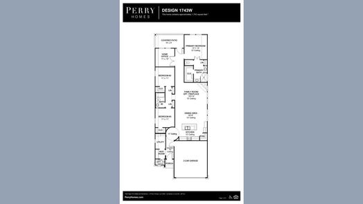 Entry with 11-foot rotunda ceiling leads to open kitchen, dining area and family room. Kitchen features corner walk-in pantry and generous island with built-in seating space. Primary suite includes double-door entry to primary bath with dual vanities, separate glass-enclosed shower and large walk-in closet. Home office with French doors set at back entrance. Large windows, extra closets and bonus mud room add to this spacious three-bedroom home. Covered backyard patio. Two-car garage.