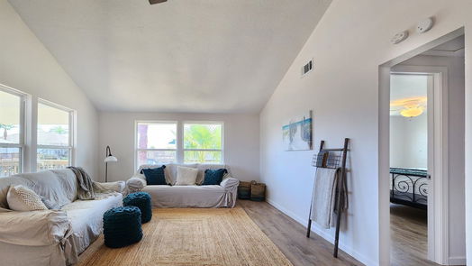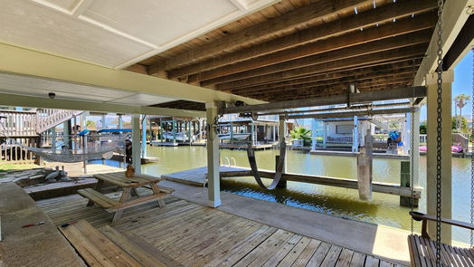 Canal Home w Boat Lift, easy access to West Bay!Inside is a stylishly furnished home w vaulted ceilings and tons of natural light flooding in thru the new windows as well as a coastal chic flare design.This canal home offers an unforgettable coastal retreat with recent updates and renovations.Step out onto the deck, covering the boat slip, and soak in the picturesque views while relaxing or entertaining guests.Airy inviting kitchen open to the LR/DR provides spacious area w a lg island for comfortable gatherings. 1 mile on a golf cart and you’ll have sun, sand, and surf.Ample parking below for cars/golf carts.Utility w storage for water/boat items.Outdoor shower available for rinsing off after beach day fun.Main level features luxurious wood LVP flooring perfect for coming in from a swim either at the beach or the neighborhood pool, or from boating in west bay off the canal. 969sf of Living area up, AND 229sf BONUS sf downstairs w another Bedroom/Bath/Storage and Utility.