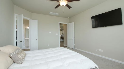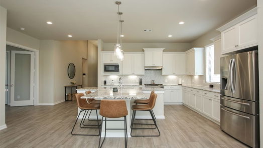 WELCOME HOME! Upon entering the foyer with beautiful wood-like tile floors you will enjoy the openness of the kitchen overlooking the combination family room and dining area. The large Chef's kitchen features amazingly unique T-shaped island with breakfast bar, double sinks, clear pendent lights, white cabinets with stainless hardware, granite countertops with gorgeous white glass tile backsplash, stainless gas oven with gas burner cooktop, stainless microwave and refrigerator. Private primary suite includes bath with separate shower and jetted tub, dual vanities, two walk-in closets with easy access to hidden large utility room. The spacious flex room can be used as a home office or game room. The backyard has a large covered back patio with a gas line perfect for outdoor kitchen or grill to include the outdoor furniture and TV. Other amenities include 8-foot doors throughout, full gutters, front and back sprinkler system. A GREAT PLACE TO CALL HOME!!!