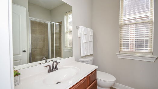 GORGEOUS 1.5 story home with 4 bedrooms (flexroom upstairs can be a 5th bedroom), 4 full baths and no back neighbors! High ceilings throughout with beautiful flooring, paint, and neutral tile. No carpet in this home! Open concept floorplan is perfect for entertaining. Family room with gas-log fireplace and views of the backyard. HUGE island in the kitchen with granite counters, stainless apps, gas range, built-in microwave, and refrigerator is included! Large breakfast area and formal dining room. Spacious primary suite with en-suite bath, dual sink vanity, granite counter, framed mirror, soaking tub, separate shower, and large closet. Upstairs game room with full bath is a perfect space for a home theater or office! Covered back patio, generous backyard, and sprinkler system. Quiet manned-gated neighborhood with amenities that include clubhouse, pool, playgrounds, basketball court, and lake.