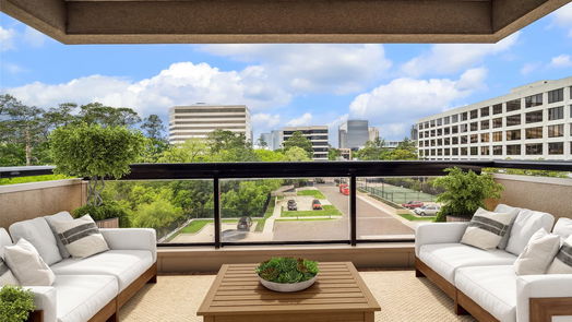 Fully renovated and spacious 2/2 plus study/den with 1,753 sf offering a great floor plan with generous storage. The open concept kitchen with breakfast bar features European style smooth close cabinetry, sleek Fisher & Paykel stainless appliances and beautiful Quartz counters. The bathrooms show beautifully with decorative sconces, under cabinet lighting, tile floors, Kohler fixtures and Quartz counters. Primary suite with a large walk-in shower, great closet space and sliding metal door with frosted glass. Luxury vinyl floors, recessed lighting, dry bar with wine cooler, full size washer and dryer. Large balcony off living room and step out balcony off the study/den. Serene 4th floor treetop views with the perfect balance of the area skyline. Full service high rise living with valet, porter, 24 hour guarded gate and concierge, pool, fitness center, tennis and party room. Convenient tucked away location just minutes from Uptown Park, Memorial Park and Downtown.
