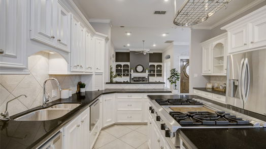 This stunning 1.5 story home features tall tray ceilings, crown molding, 8-foot doors, plantation shutters, and custom lighting throughout the space. The main living areas boast oversized tile, while the bedrooms are outfitted with luxury vinyl. The study features French doors and a built-in desk with shelving. The primary suite has a spa-like ensuite bathroom with a jetted tub, oversized walk-in shower, and 2 closets with automatic lighting & built-ins. The chef's island kitchen is a TRUE culinary dream, featuring two new Fisher & Paykel dishwashers, Dacor convection oven, a Viking gas cooktop, breakfast area and a belly bar open to the family room. An upstairs game room is carpeted & wired for sound. Two outdoor patios! UPGRADES: 2023 ROOF**2019 Trane XR A/C**New Fencing**New Patio Awning**Double Pane Windows**Radiant Barrier**H2O Softener**Reverse Osmosis Filtration**Mosquito Misting System**Washer, Dryer, & Refrigerator included. Just a short walk to the Champions Golf Course
