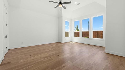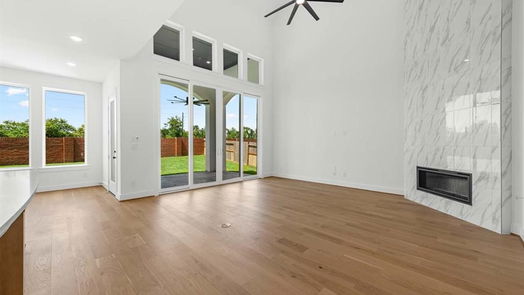 MLS# 77594831 - Built by Highland Homes - Ready Now! ~ No Back Neighbors! Painted white brick exterior! Open floor plan boast a grand entry w/ double doors & soaring ceilings. 2 bedrooms down! Cozy fireplace in family room w/ sliding glass doors. Chef's kitchen w/ lots of cabinets & built in custom hutch. Wood stairs lead up to the spacious game & media room along w/ oversized secondary bedrooms each w/ own bath. Wood flooring in all main areas of the home including the study & primary suite. Pool sized lot!!!