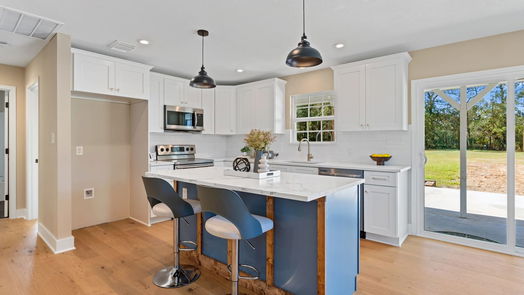 Discover modern farmhouse living at 99 Meyer Road! This beautifully remodeled 4-bedroom, 2-bathroom home is just 10 minutes from the Valley Ranch shopping center in New Caney. The spacious kitchen boasts brand new quartz countertops, custom wood cabinetry with soft-close doors and drawers, and a kitchen island, perfect for gatherings. White oak wood floors add warmth to the living spaces, while new carpet in all bedrooms ensures comfort. Enjoy natural light through brand new windows throughout the home. Situated on a fully fenced property with two gates, the expansive lot allows for horses and includes a brand new workshop building with electricity. No restrictions give you the freedom to create your ideal lifestyle. Located within Huffman ISD and minutes from highways 59 and 99, this property offers a perfect blend of rural charm and modern convenience.