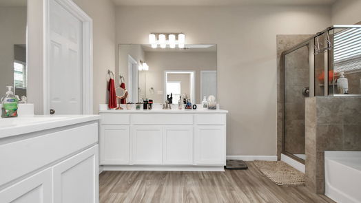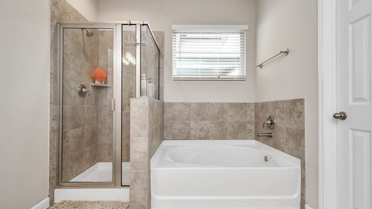 Quick close! Ready now! Check out this beautiful brick and stone 1-story, 3 bed-3 full bathroom home. Enjoy the open family room. Create delicious meals in the island kitchen which includes white 42 inch cabinets, granite counter tops, under mount sink, stainless steel appliances, 2 inch faux wood blinds. The primary suite includes dual sinks, and a soaking tub with elevated shower. Enjoy the large covered rear patio. The neighborhood features parks and nearby schools in Tomball ISD. CHECK OUT THE VIRTUAL TOUR!